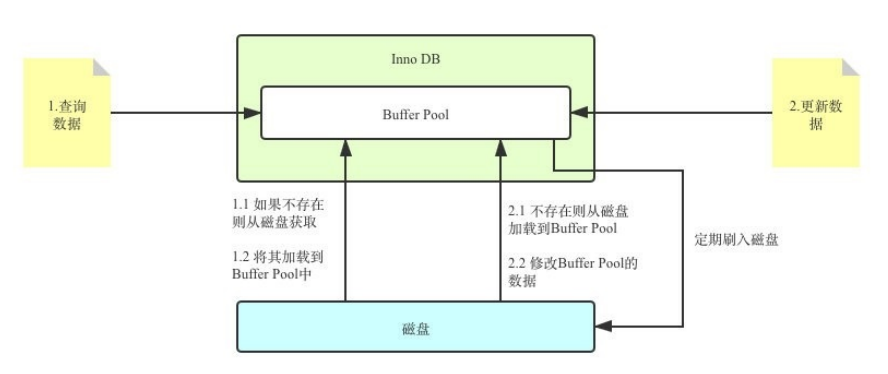 当我们查询数据的时候,会先去Buffer Pool中查询。如果Buffer Pool中不存在,存储引擎会先将数据从磁盘加载到Buffer Pool中,然后将数据返回给客户端;同理,当我们更新某个数据的时候,如果这个数据不存在于Buffer Pool,同样会先数据加载进来,然后修改修改内存的数据。被修改过的数据会在之后统一刷入磁盘。