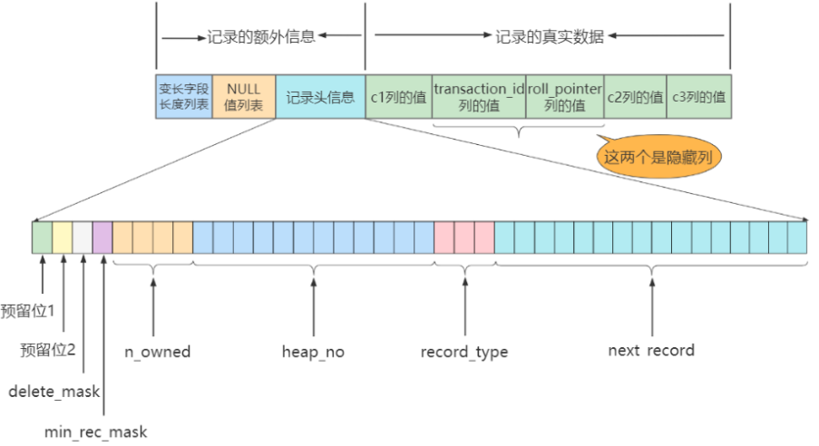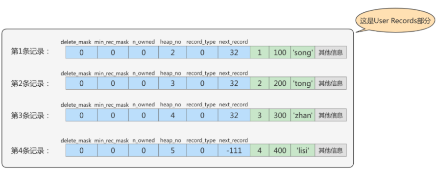 指定的行格式一条一条摆在User Records部分,相互之间形成单链表。用户记录里的一条条数据如何记录?这里需要讲讲记录