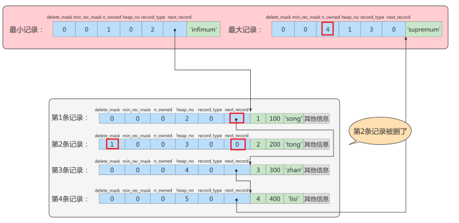 - 你以为它删除了,可它还在真实的磁盘上。这些被删除的记录之所以不立即从磁盘上移除,是因为移除它们之后其他的记录在磁盘上需要