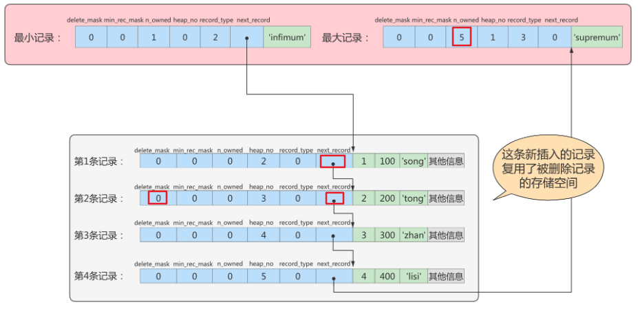 重新排列,导致性能消耗。所以只是打一个删除标记而已,所有被删除掉的记录都会组成一个所谓的垃圾链表,在这个链表中的记录占用的空间称之为可重用空间,之后如果有新记录插入到表中的话,可能把这些被删除的记录占用的存储空间覆盖掉。