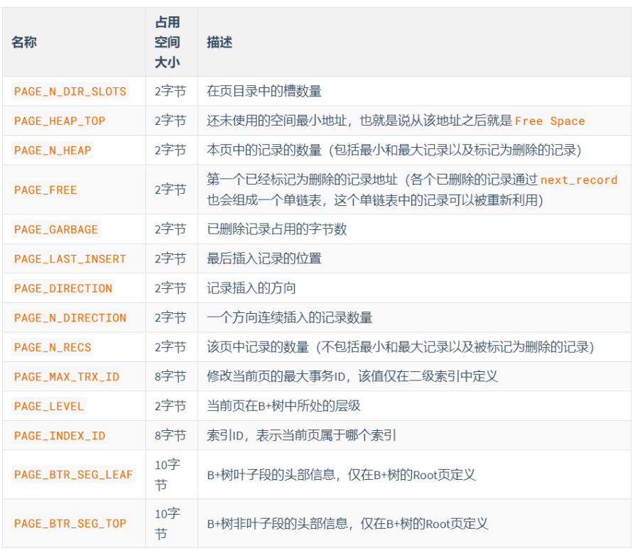 File Header作为第一个组成部分,它描述了一些针对各种页都通用的一些信息,比方说这个页的编号是多少,它的上一个页、下一个页是谁等,所有的数据页会组成一个双链表。这个部分占用固定的38个字节,是由下边这些内容组成的: