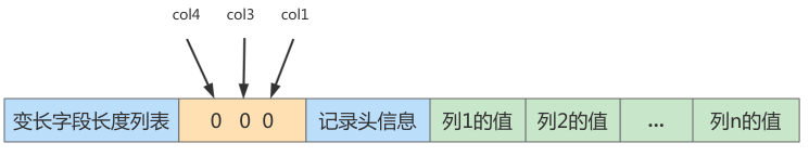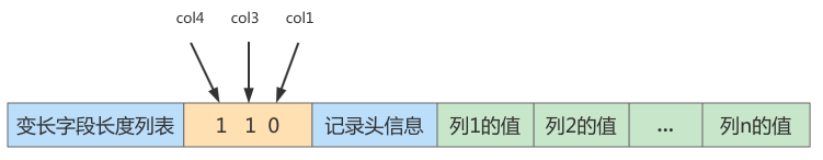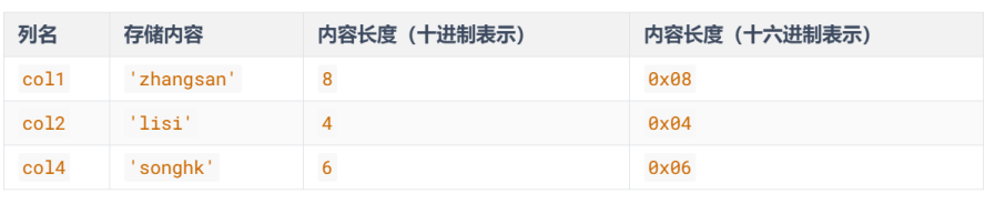 - 如果该存储NULL值的字段是变长数据类型的,则不在记录的真实数据处占用任何存储空间。
