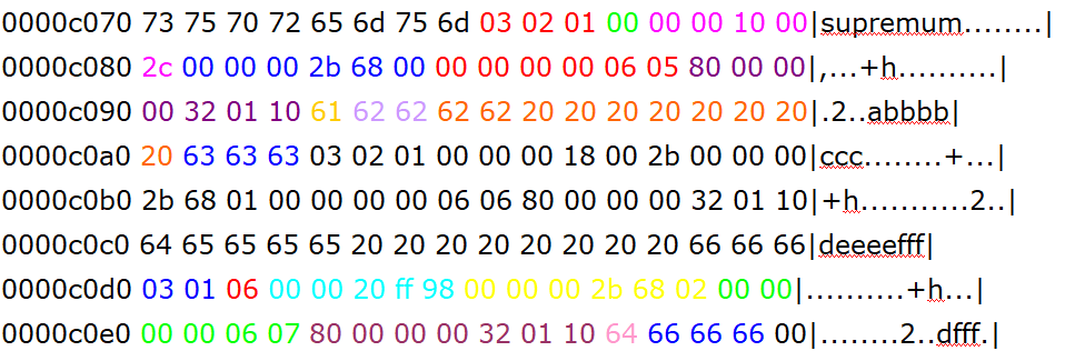 CHAR(10),占用记录的真实数据部分10字节,所以我们看到在Redundant行格式中使用0x00000000000000000000来表示NULL值。另外,c3列对应的偏移量为0xA4,它对应的二进制实际是:10100100,可以看到最高位为1,意味着该列的值是NULL。将最高位去掉后的值变成了0100100,对应的十进制值为36,而c2列对应的偏移量为0x1A,也就是十进制的26。36 - 26 = 10,也就是说最终c3列占用的存储空间为10个字节。