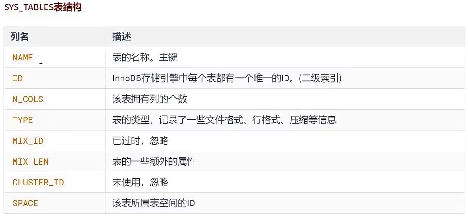 information_schema数据库中的这些以INNODB_SYS开头的表并不是真正的内部系统表(内部系统表就是我们上边以SYS开头的那些表),而是在存储引擎启动时读取这些以SYS开头的系统表,然后填充到这些以INNODB_SYS开头的表中。以INNODB_SYS开头的表和以SYS开头的表中的字段并不完全一样,但供大家参考已经足矣。