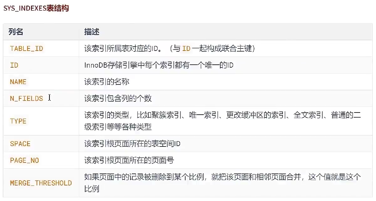 -该表有多少索引,每个索引对应哪几个字段,该索引对应的根页面在哪个表空间的哪个页面