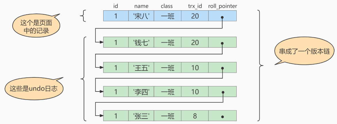UPDATE student SET name="宋八" WHERE id = 1;此刻,表student中id为1的记录的版本链就长这样: