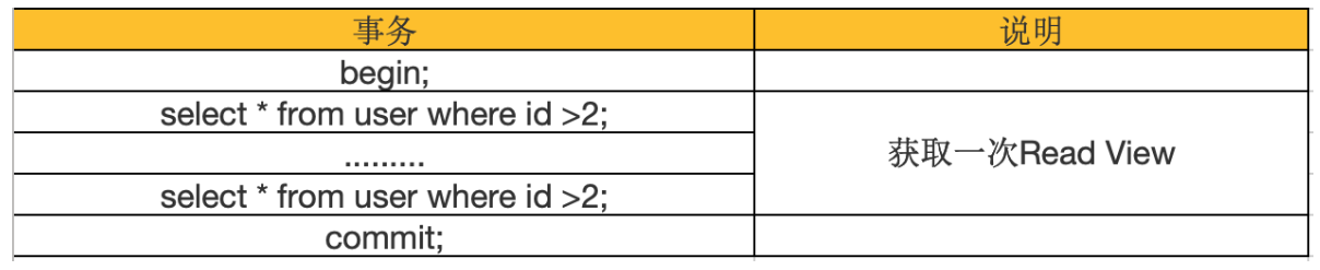 当隔离级别为可重复读的时候,就避免了不可重复读,这是因为一个事务只在第一次SELECT的时候会获取一次Read View,而后面所有的SELECT都会复用这个Read View,如下表所示: