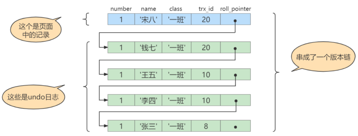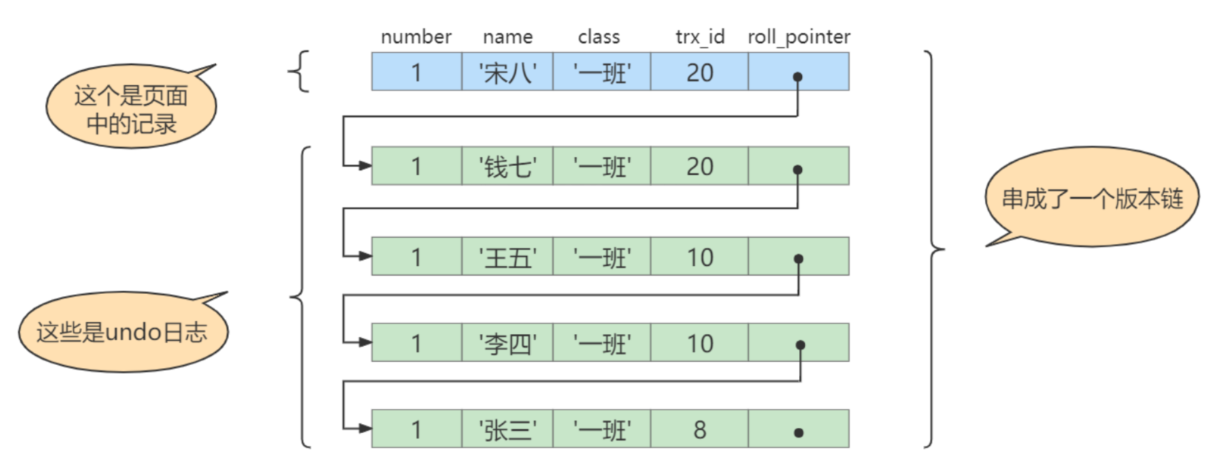 undo日志中,就算是该记录的一个旧版本,随着更新次数的增多,所有的版本都会被roll_pointer属性连接成一个链表,我们把这个链表称之为版本链,版本链的头节点就是当前记录最新的值。每个版本中还包含生成该版本时对应的