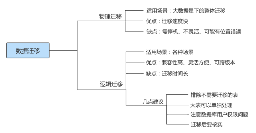 - 根据不同的需求可能要采取不同的迁移方案,但总体来讲,MySQL数据迁移方案大致可以分为