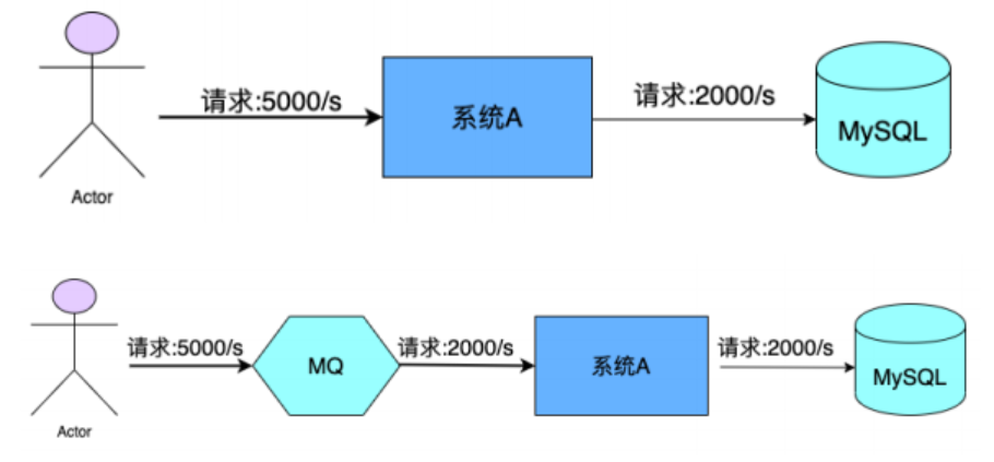 限流削峰。MQ可以将系统的超量请求暂存其中,以便系统后期可以慢慢进行处理,从而避免了请求的丢失或系统被压垮。