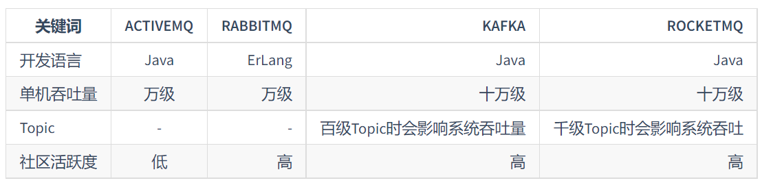 - RabbitMQ是使用ErLang语言开发的一款MQ产品。其吞吐量较Kafka与RocketMQ要低,且由于其不是Java语言开发,所以公司内部对其实现定制化开发难度较大。
