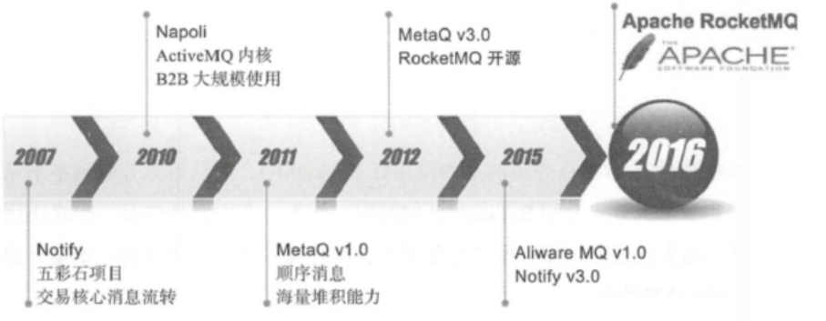- 2007年,阿里开始五彩石项目,Notify作为项目中交易核心消息流转系统,应运而生。Notify系统是RocketMQ的雏形。