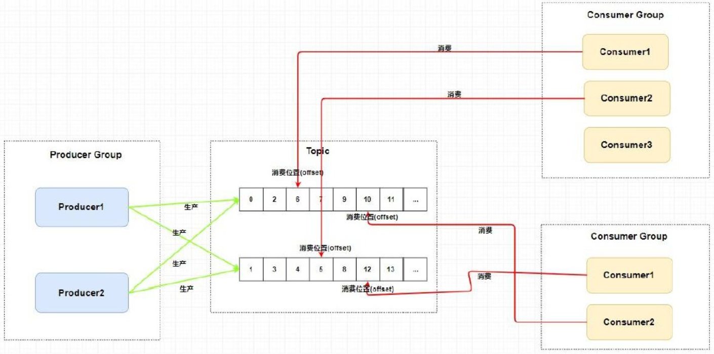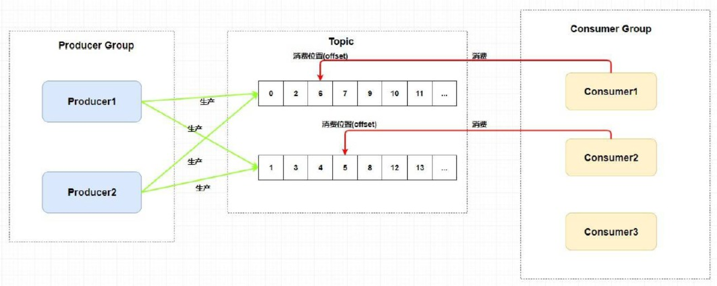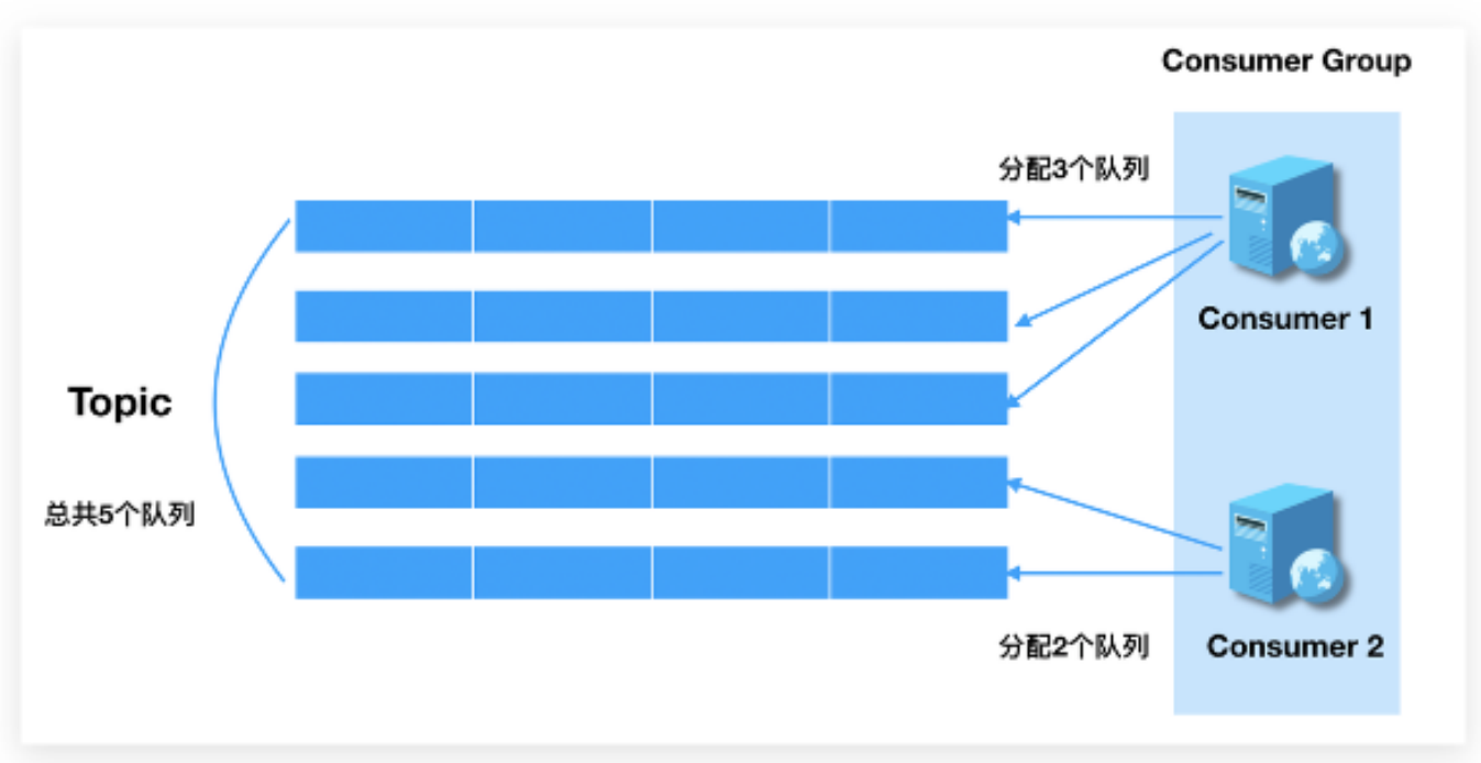 - 一个Topic的Queue中的消息只能被一个消费者组中的一个消费者消费。一个Queue中的消息不允许同一个消费者组中的多个消费者同时消费。