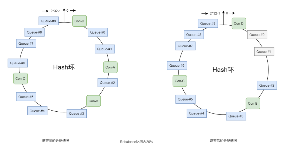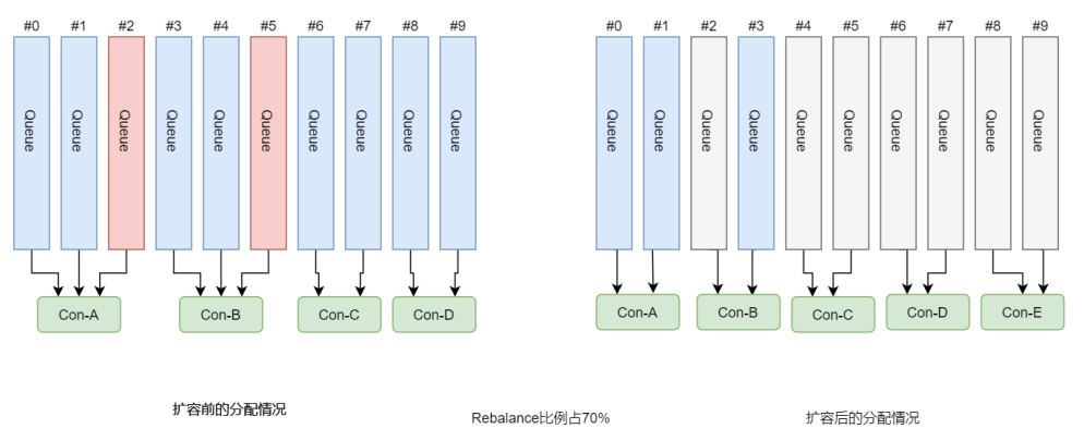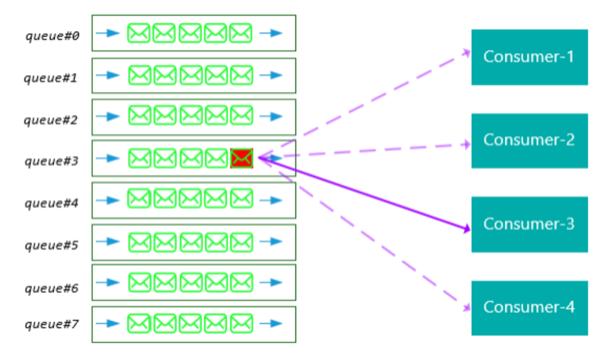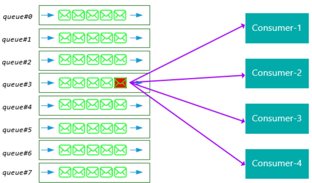 将一个Topic中的不同的Queue平均分配给同一个Consumer Group的不同的Consumer,注意,并不是将消息负载均衡)和容错(一个Consmer挂了,该Consumer Group中的其它Consumer可以接着消费原Consumer消费的Queue)的目标变得非常容易。消费者组中Consumer的数量应该小于等于订阅Topic的Queue数量。如果超出Queue数量,则多出的Consumer将不能消费消息。(