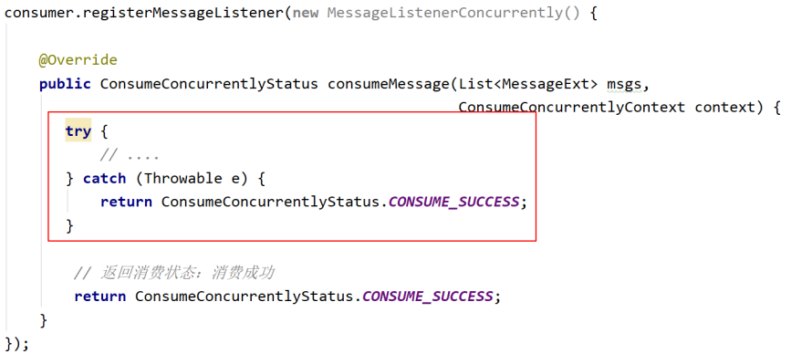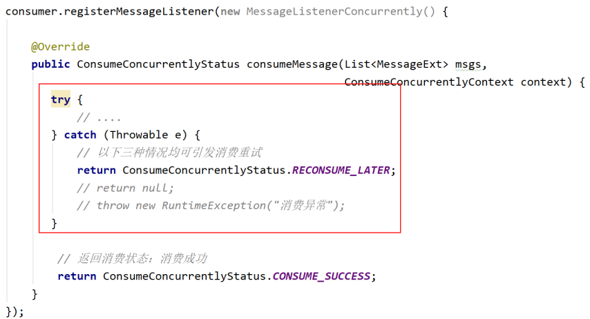 集群消费方式下,消息消费失败后若不希望消费重试,则在捕获到异常后同样也返回与消费成功后的相同的结果,即ConsumeConcurrentlyStatus.CONSUME_SUCCESS,则不进行消费重试。