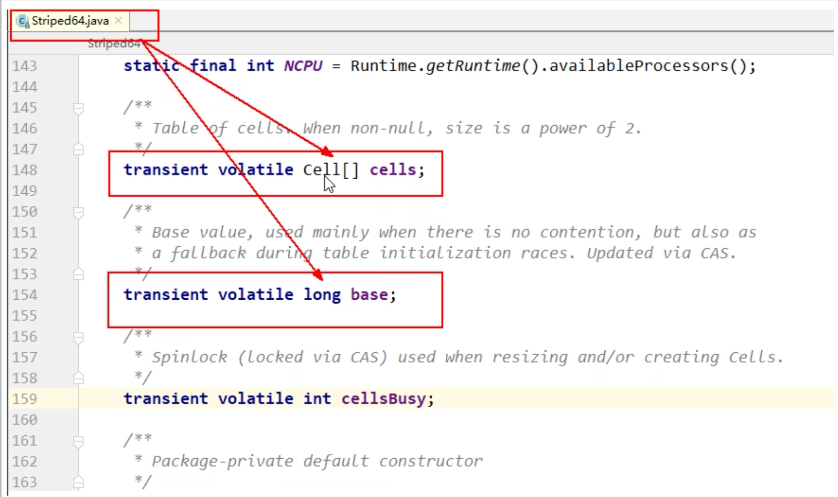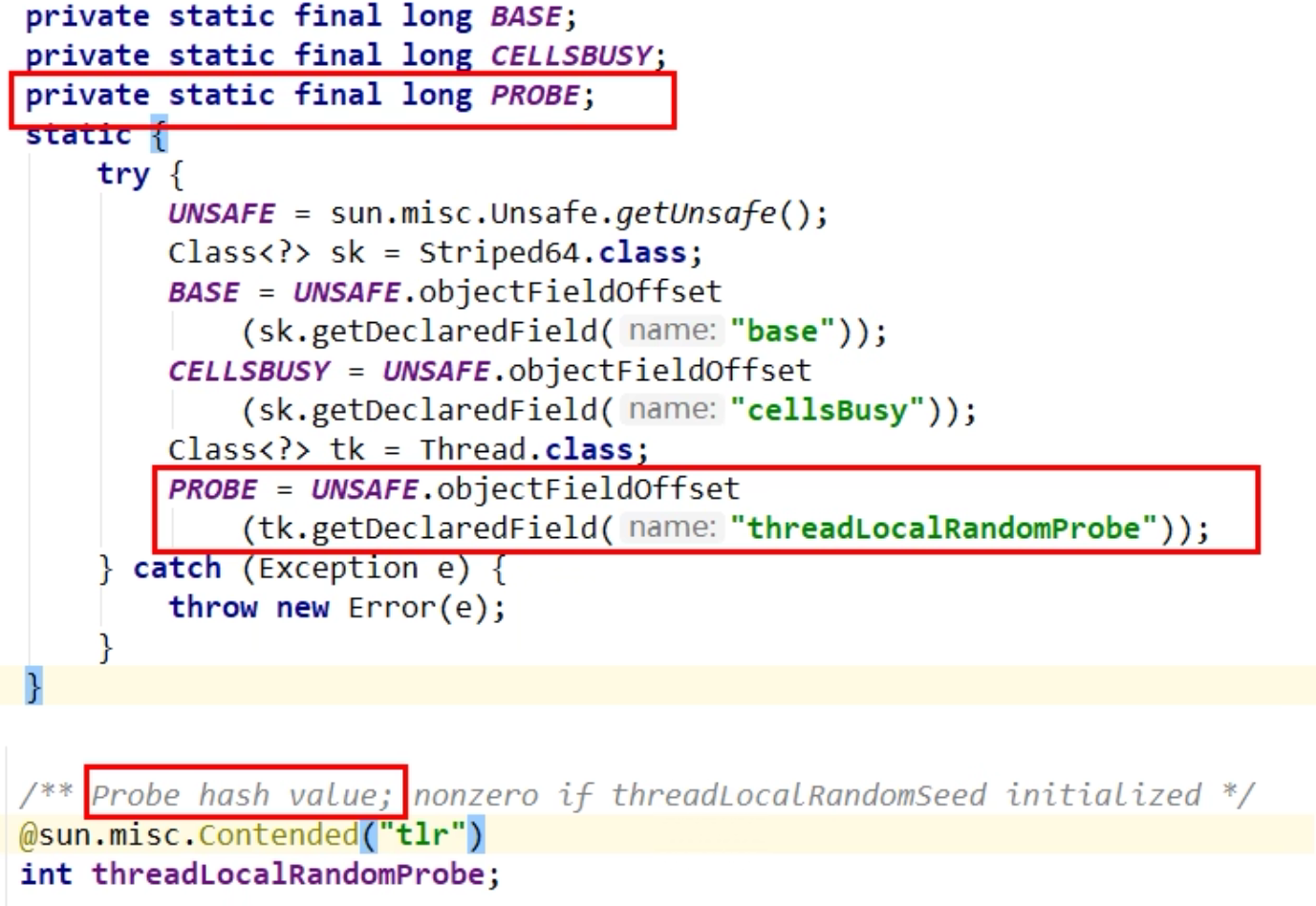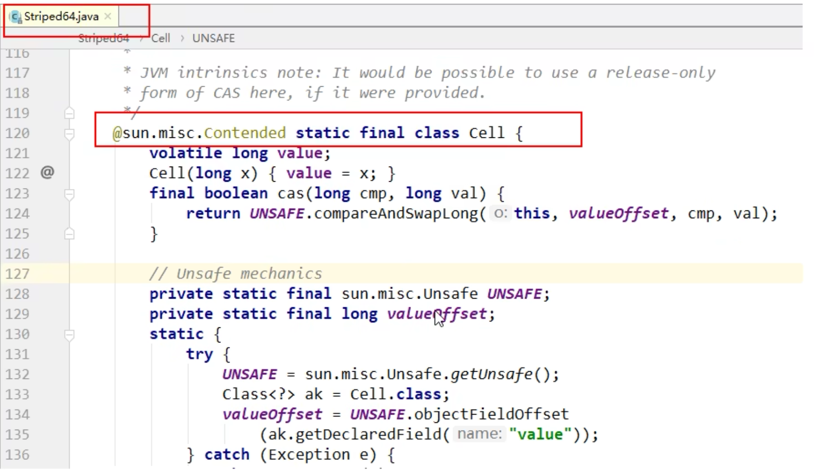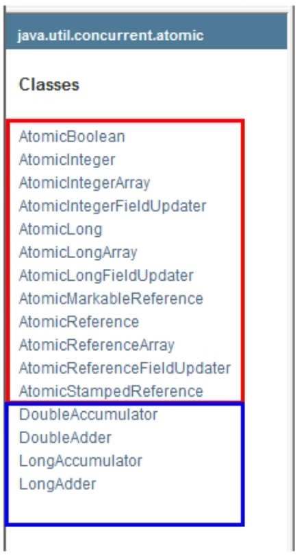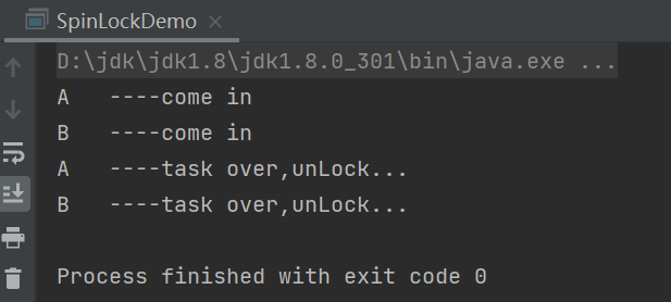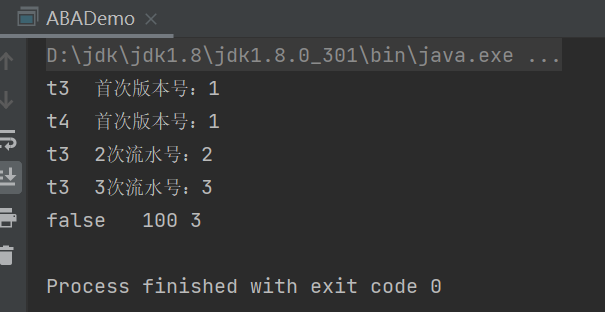 | public class ABADemo { static AtomicInteger atomicInteger = new AtomicInteger(100); static AtomicStampedReference<Integer> stampedReference = new AtomicStampedReference<>(100, 1); public static void main(String[] args) { new Thread(() -> { int stamp = stampedReference.getStamp(); System.out.println(Thread.currentThread().getName() + "\t" + "首次版本号:" + stamp); try { TimeUnit.MILLISECONDS.sleep(500); } catch (InterruptedException e) { e.printStackTrace(); } stampedReference.compareAndSet(100, 101, stampedReference.getStamp(), stampedReference.getStamp() + 1); System.out.println(Thread.currentThread().getName() + "\t" + "2次流水号:" + stampedReference.getStamp()); stampedReference.compareAndSet(101, 100, stampedReference.getStamp(), stampedReference.getStamp() + 1); System.out.println(Thread.currentThread().getName() + "\t" + "3次流水号:" + stampedReference.getStamp()); }, "t3").start(); new Thread(() -> { int stamp = stampedReference.getStamp(); System.out.println(Thread.currentThread().getName() + "\t" + "首次版本号:" + stamp); try { TimeUnit.SECONDS.sleep(1); } catch (InterruptedException e) { e.printStackTrace(); } boolean b = stampedReference.compareAndSet(100, 2022, stamp, stamp + 1); System.out.println(b + "\t" + stampedReference.getReference() + "\t" + stampedReference.getStamp()); }, "t4").start(); } private static void abaHappen() { new Thread(() -> { atomicInteger.compareAndSet(100, 101); try { TimeUnit.MILLISECONDS.sleep(10); } catch (InterruptedException e) { e.printStackTrace(); } atomicInteger.compareAndSet(101, 100); }, "t1").start(); new Thread(() -> { try { TimeUnit.MILLISECONDS.sleep(200); } catch (InterruptedException e) { e.printStackTrace(); } System.out.println(atomicInteger.compareAndSet(100, 2022) + "\t" + atomicInteger.get()); }, "t2").start(); } }