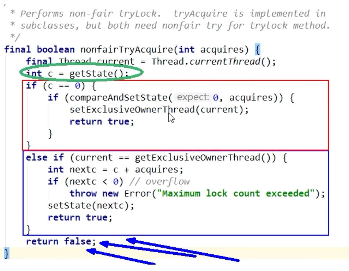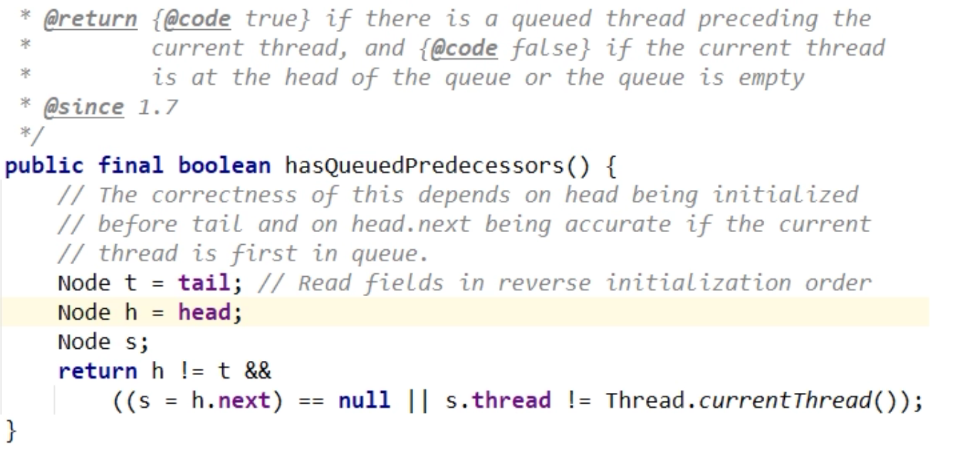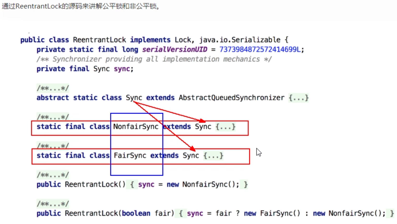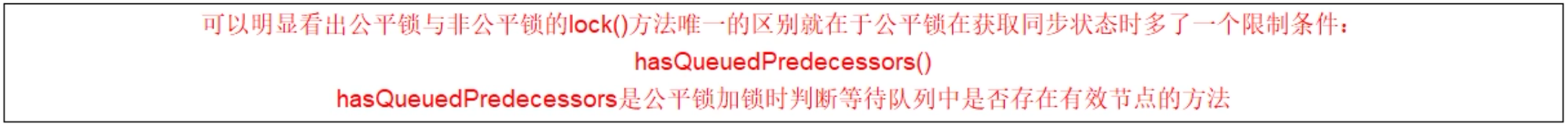 对比公平锁和非公平锁的tryAcquire()方法的实现代码,其实差别就在于非公平锁获取锁时比公平锁中少了一个判断!hasQueuedPredecessors()。