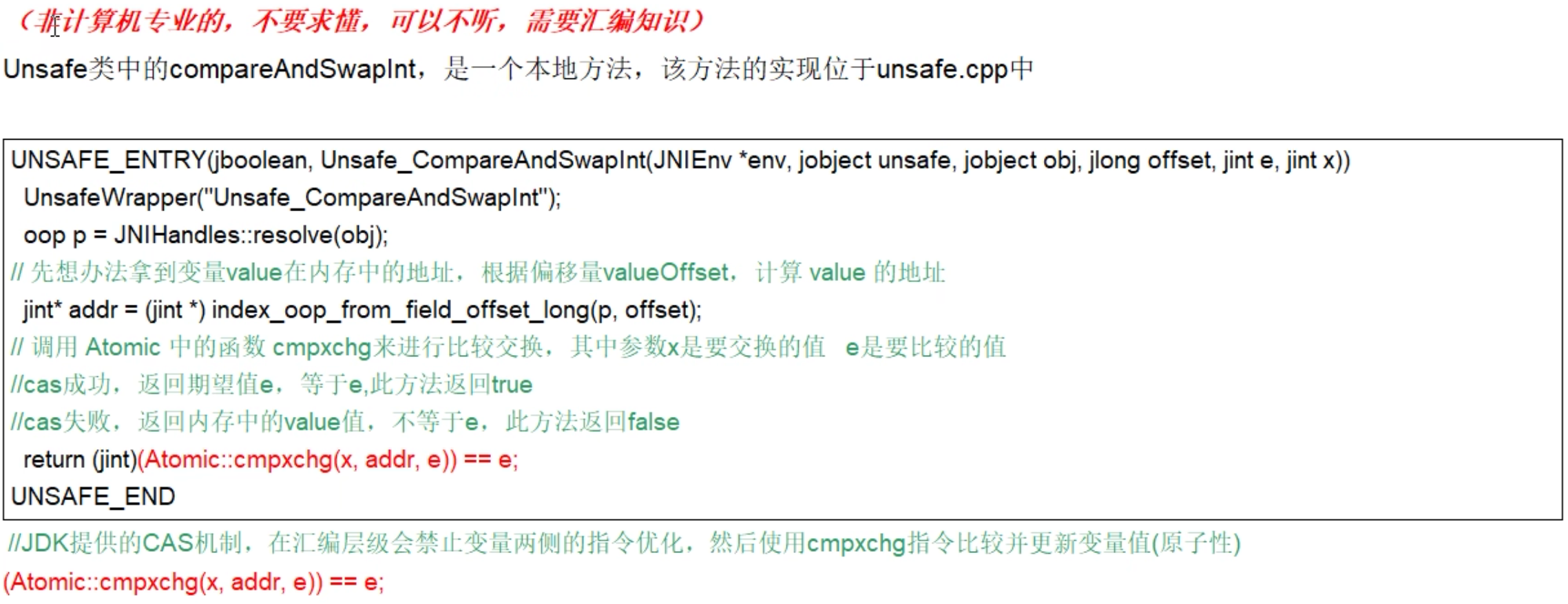 - 你只需要记住:CAS是靠硬件实现的从而在硬件层面提升效率,最底层还是交给硬件来保证原子性和可见性实现方式是基于硬件平台的汇编指令,在intel的CPU中(X86机器上),使用的是汇编指令cmpxchg指令。