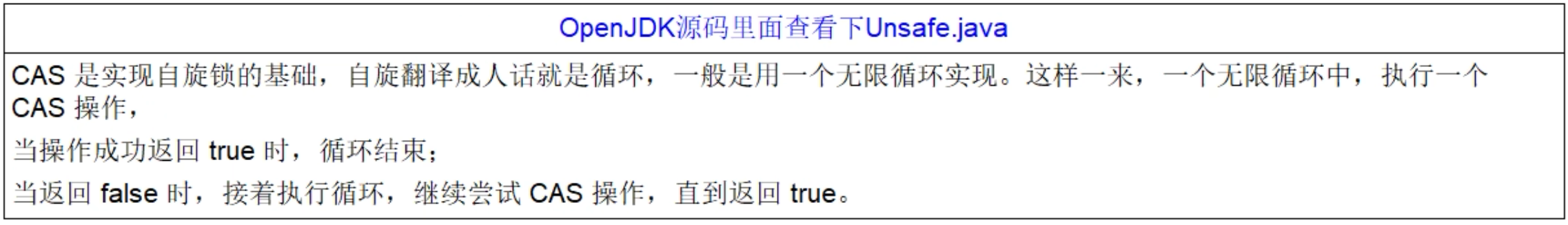 CAS(CompareAndSwap),CAS有3个操作数,位置内存值V,旧的预期值A,要修改的更新值B。当且仅当旧的预期值A和内存值V相同时,将内存值V修改为B,否则什么都不做或重来。当它重来重试的这种行为成为—-自旋!!