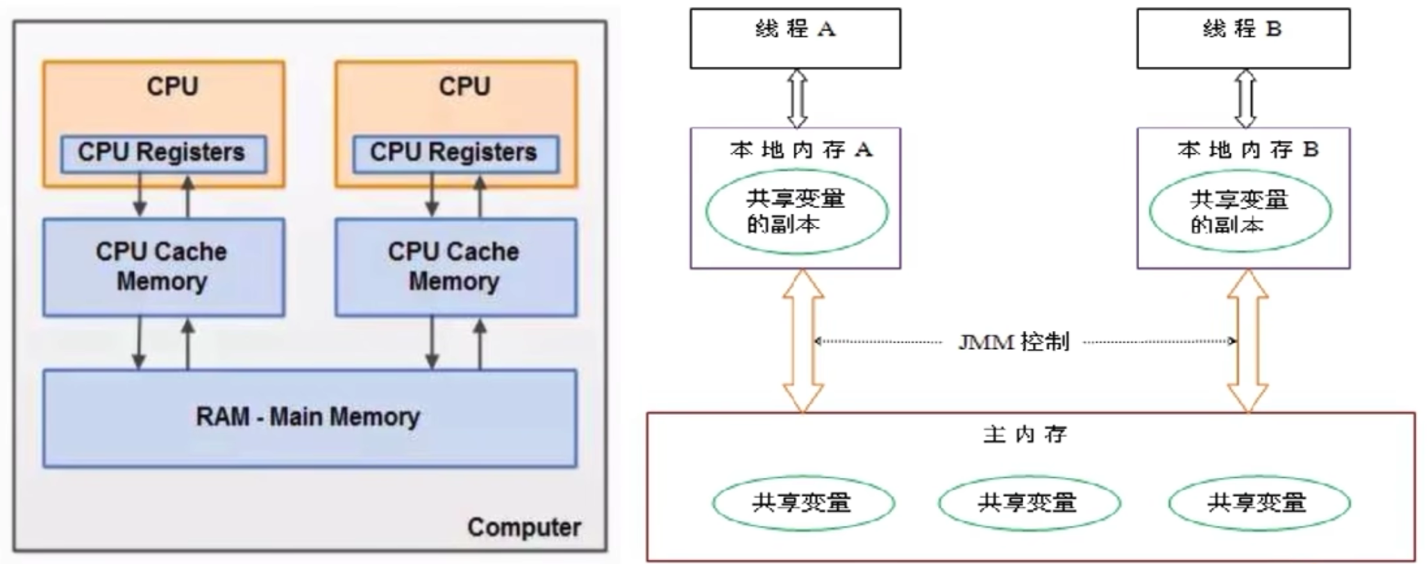 - 线程之间的共享变量存储在主内存中(从硬件角度来说就是内存条)。