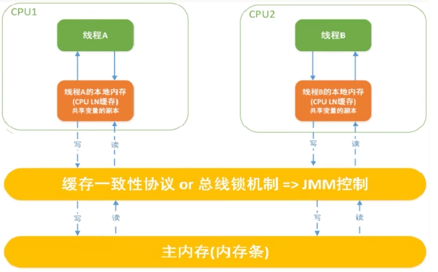 因为有这么多级的缓存(cpu和物理主内存的速度不一致的),CPU的运行并不是直接操作内存而是先把内存里边的数据读到缓存,而内存的读和写操作的时候就会造成不一致的问题。