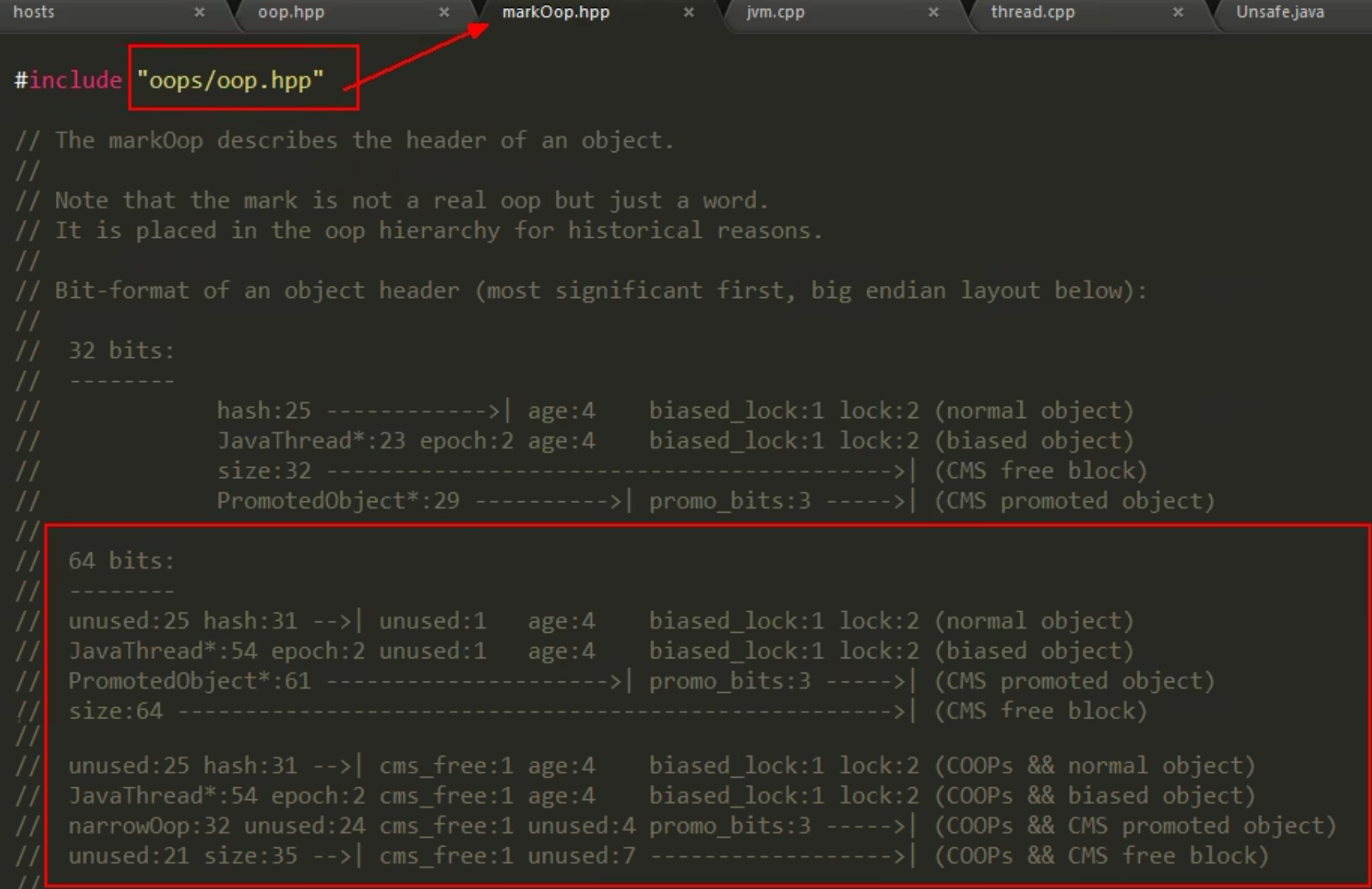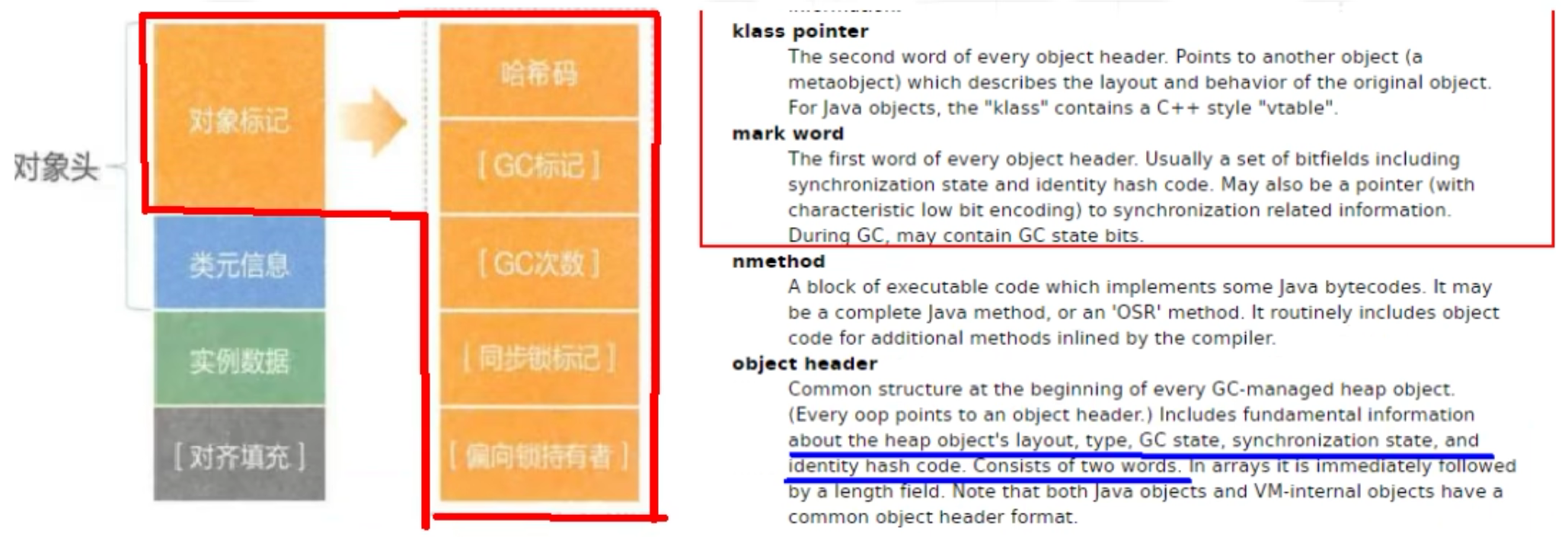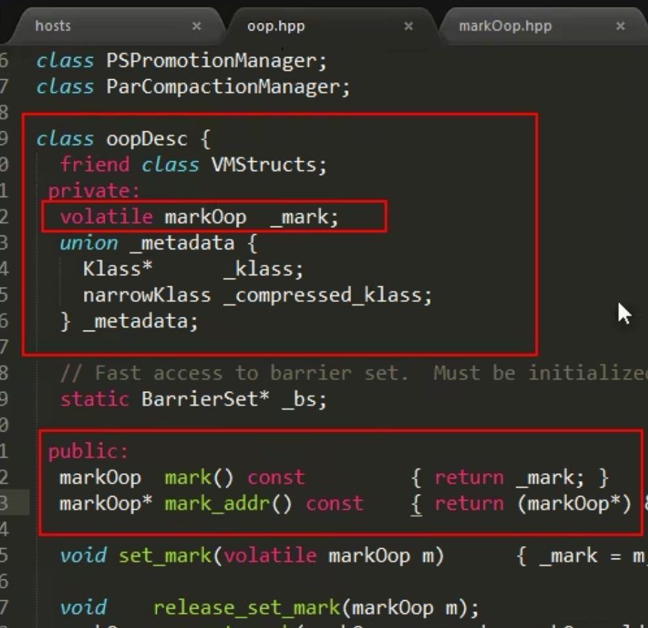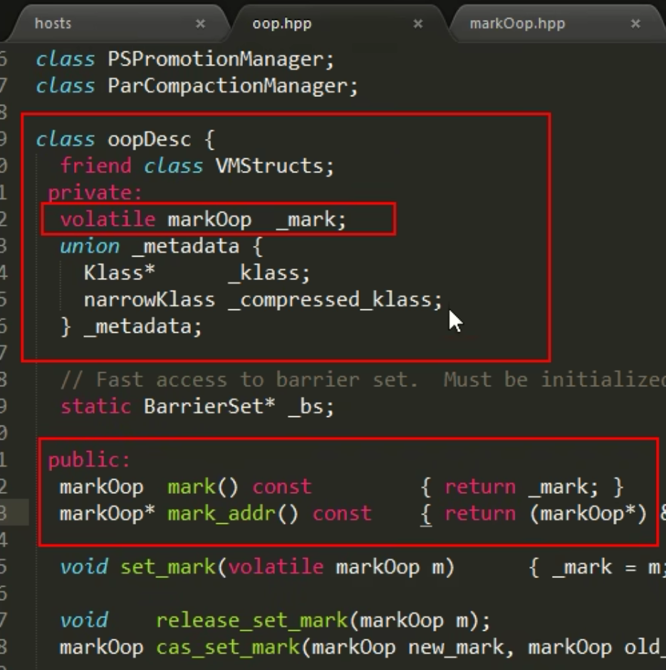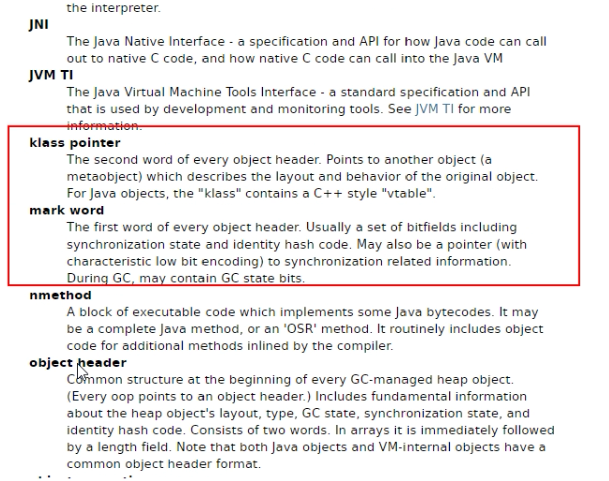 - _mark字段是mark word,_metadata是类指针klass pointer,对象头(object header)即是由这两个字段组成,这些术语可以参考Hotspot术语表。