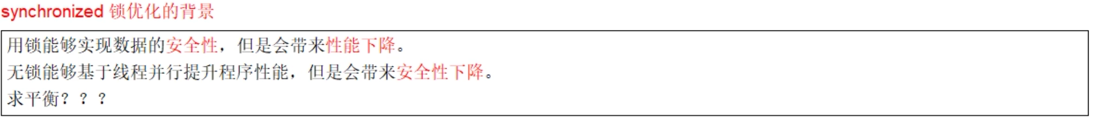 - JDK1.6之前synchronized使用的是重量级锁,JDK1.6之后进行了优化,拥有了无锁->偏向锁->轻量级锁->重量级锁的升级过程,而不是无论什么情况都使用重量级锁。