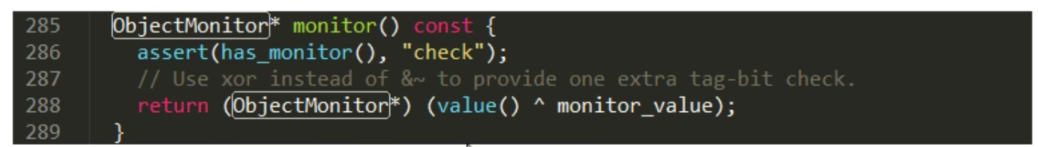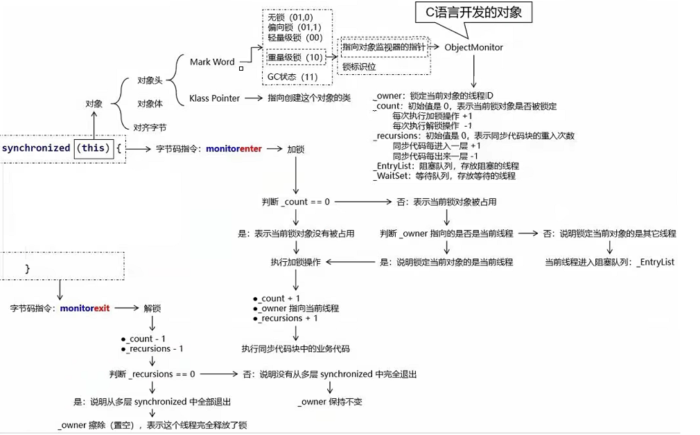- 如果一个java对象被某个线程锁住,则该java对象的Mark Word字段中LockWord指向monitor的起始地址。