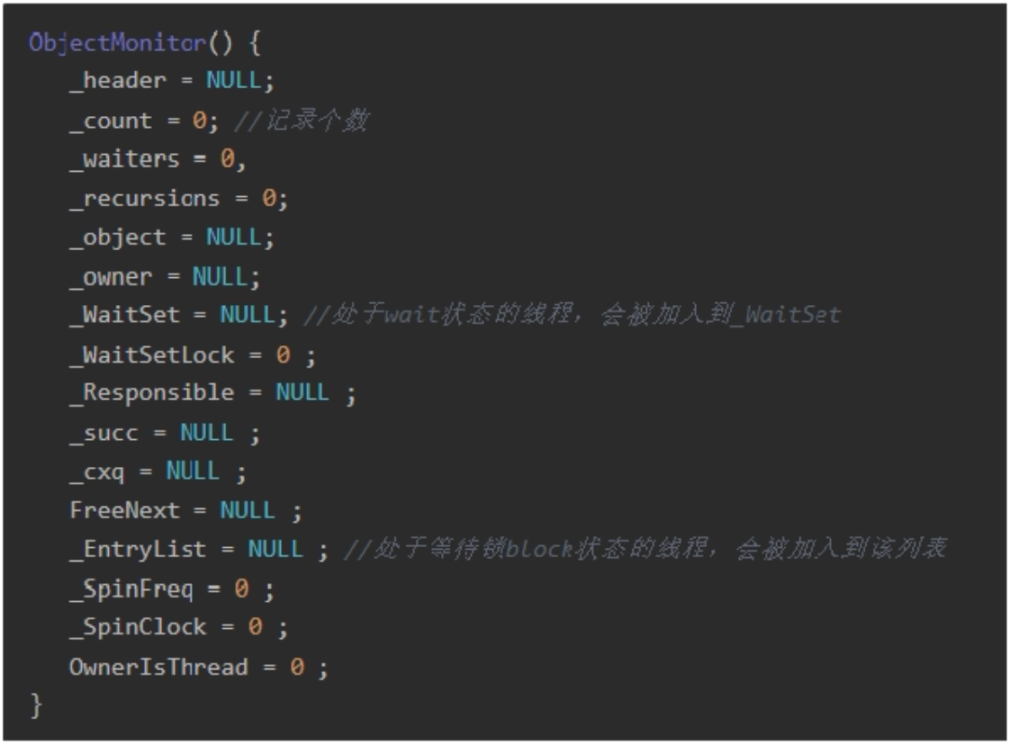 JVM中的同步就是基于进入和退出管程(Monitor)对象实现的。每个对象实例都会有一个Monitor,Monitor可以和对象一起创建、销毁。 Monitor是由ObjectMonitor实现,而ObjectMonitor是由C++的ObjectMonitor.hpp文件实现,如下所示: