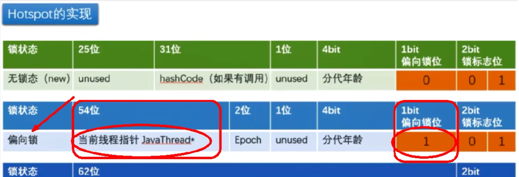 技术实现:一个synchronized方法被一个线程抢到了锁时,那这个方法所在的对象就会在其所在的Mark Word中将偏向锁修改状态位,同时还会有占用前54位来存储线程指针作为标识。若该线程再次访问同一个synchronized方法时,该线程只需去对象头的Mark Word中去判断一下是否有偏向锁指向本身的ID,无需再进入Monitor去竞争对象了。