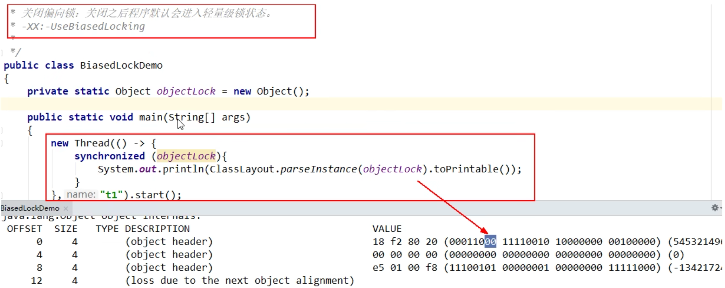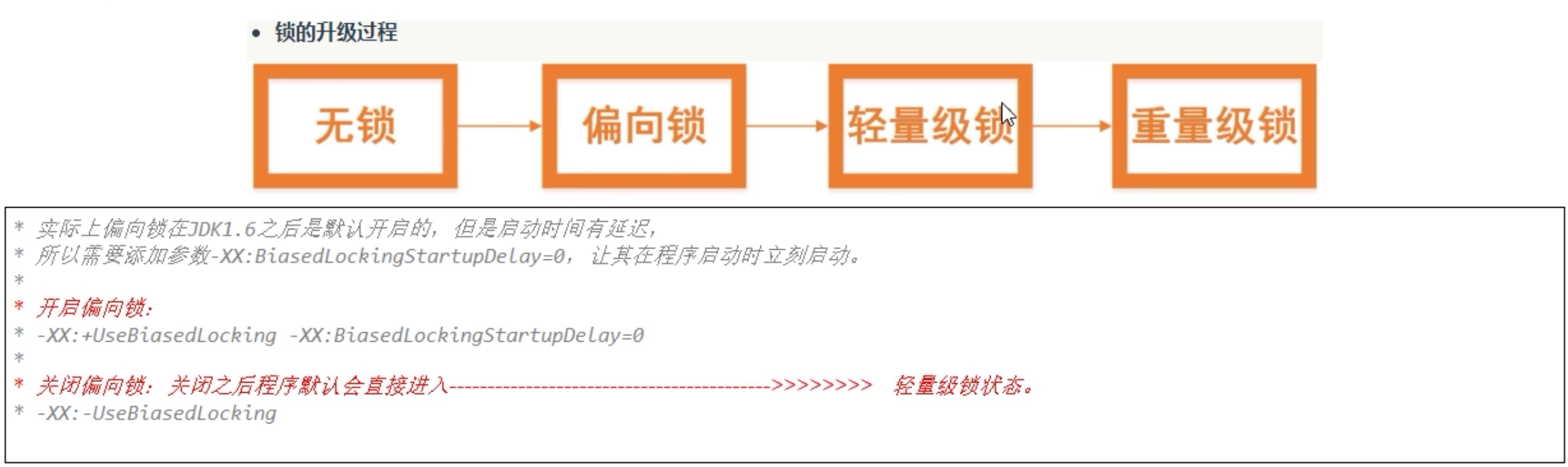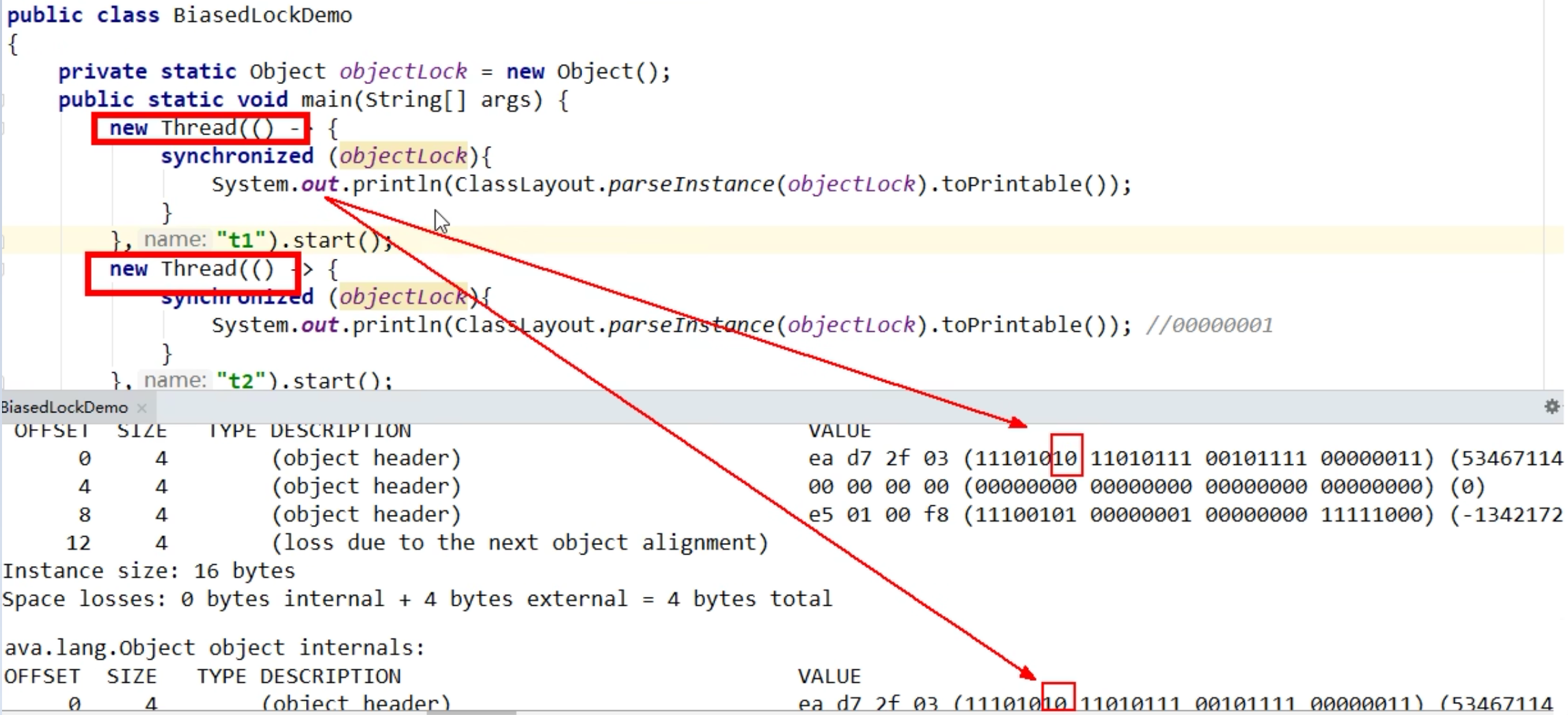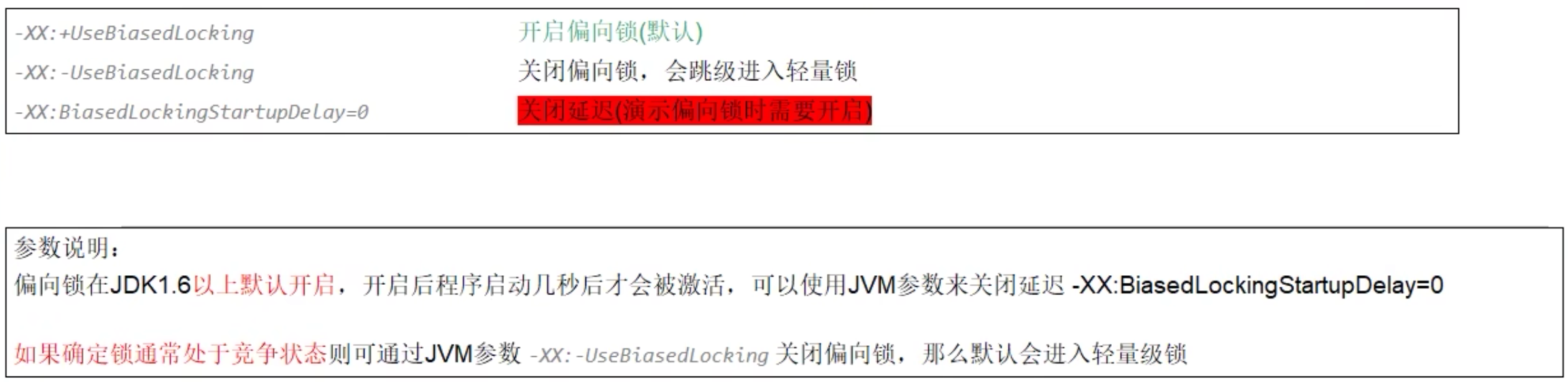 - 注意,偏向锁只有遇到其他线程尝试竞争偏向锁时,持有偏向锁的线程才会释放锁,线程是不会主动释放偏向锁的。