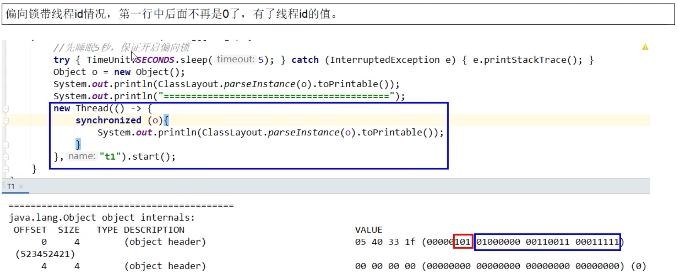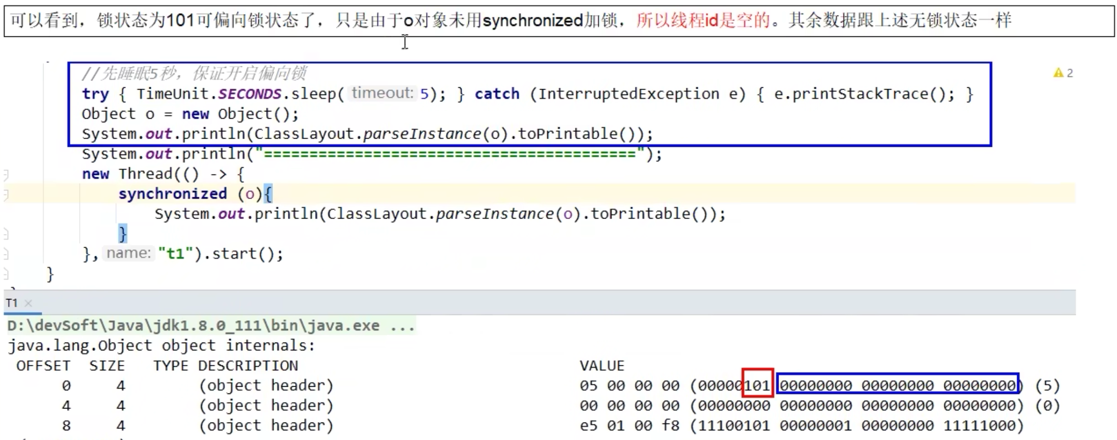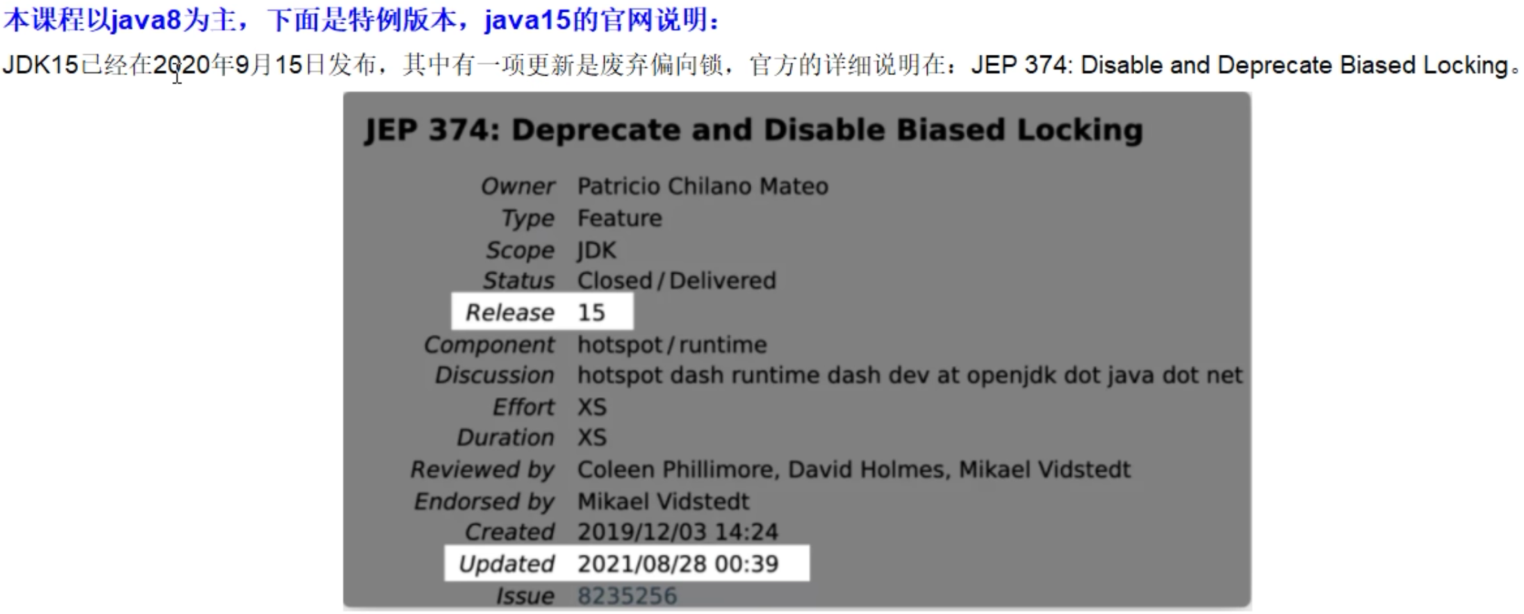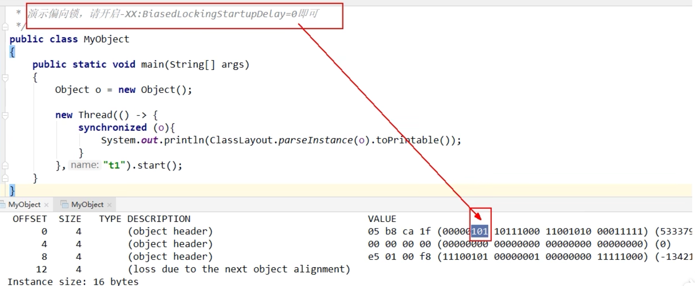 - 注意,偏向锁只有遇到其他线程尝试竞争偏向锁时,持有偏向锁的线程才会释放锁,线程是不会主动释放偏向锁的。
