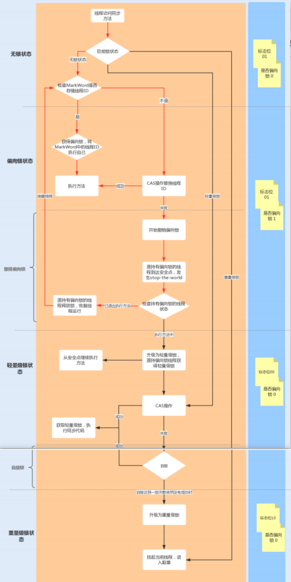 - ②第一个线程执行完成synchronized方法(退出同步块),则将对象头设置成无锁状态并撤销偏向锁,重新偏向。