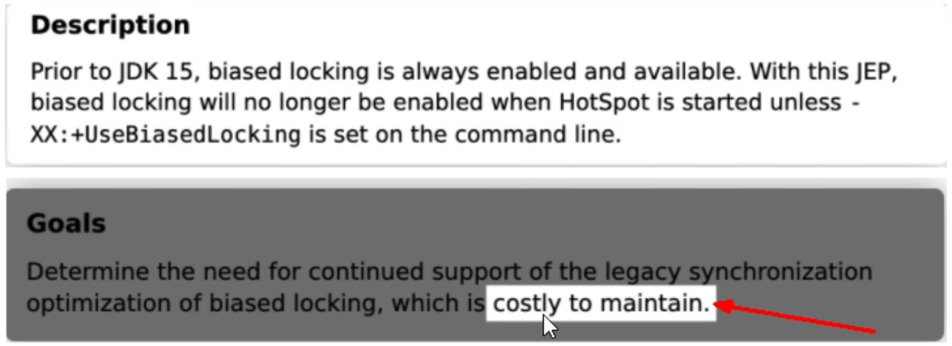 偏向锁使用一种等到竞争出现才释放锁的机制,只有当其他线程竞争锁时,持有偏向锁的原来线程才会被撤销。撤销需要等待全局安全点(该时间点上没有字节码正在执行),同时检查持有偏向锁的线程是否还在执行:
