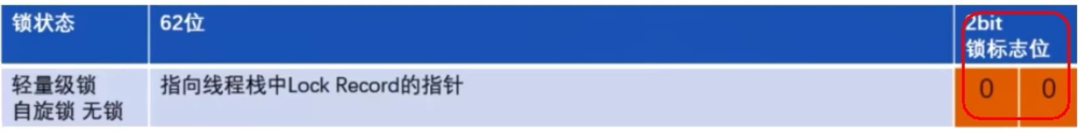 如果锁获取失败,则偏向锁升级为轻量级锁(设置偏向锁标识为0并设置锁标志位为00),此时轻量级锁由原持有偏向锁的线程持有,继续执行其同步代码,而正在竞争的线程B会进入自旋等待获得该轻量级锁。