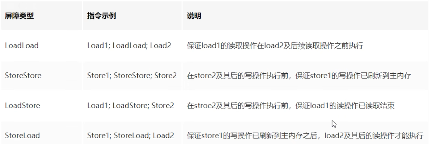- 内存屏障:是一种屏障指令,它使得CPU或编译器对屏障指令的前和后所发出的内存操作执行一个排序的约束。也叫内存栅栏或栅栏指令。