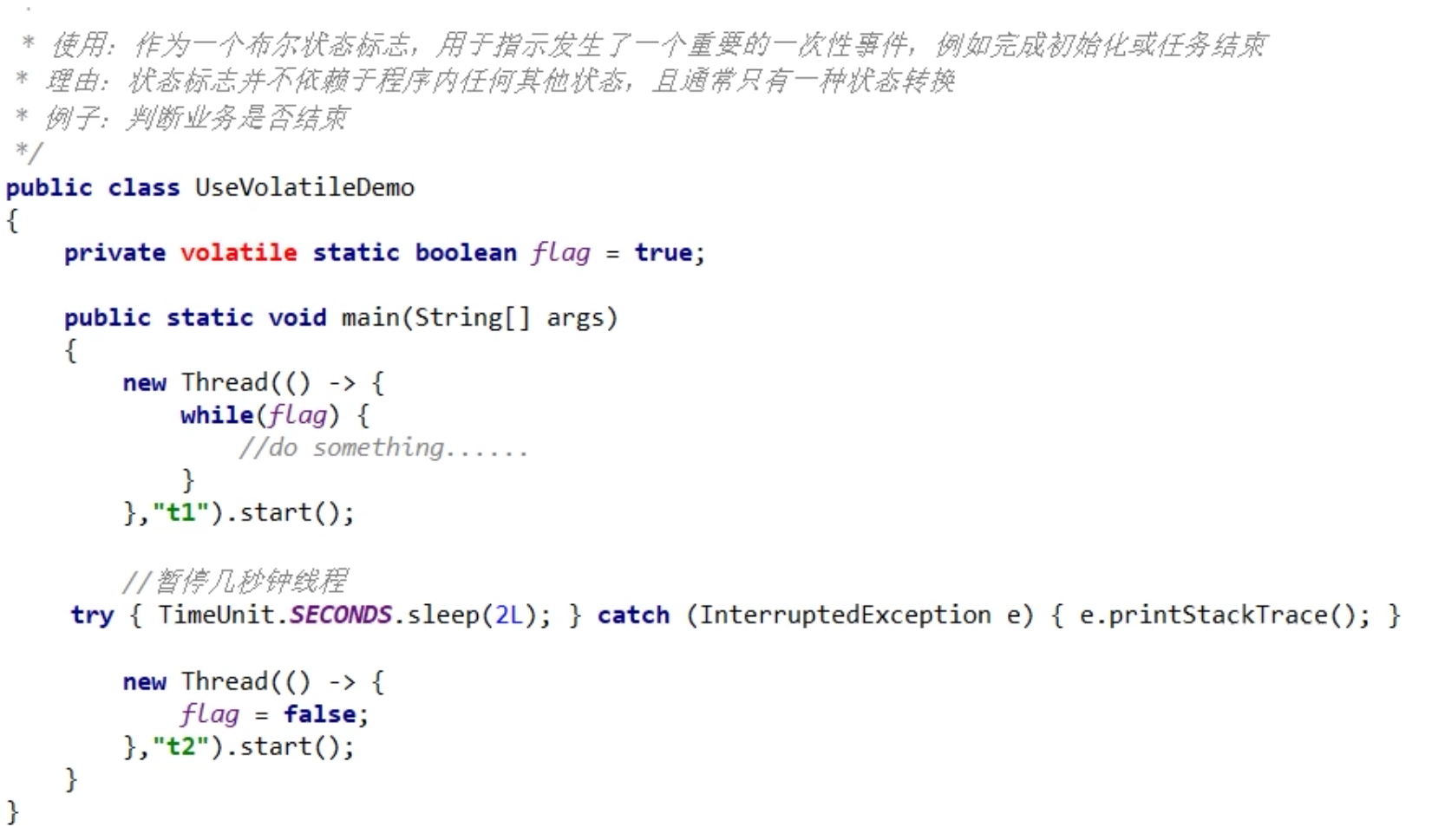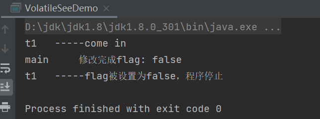 - 主线程将flag刷新到了主内存,但是t1一直读取的是自己工作内存中flag的值,没有去主内存中更新获取flag最新的值。