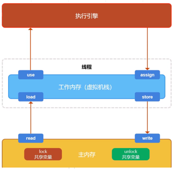 - write:作用于主内存,将store传输过来的变量值赋值给主内存中的变量。