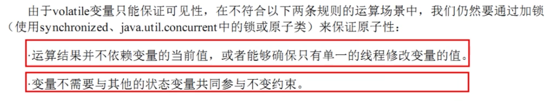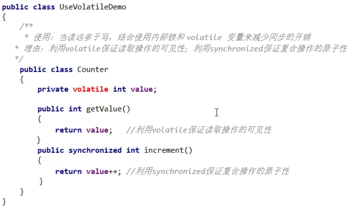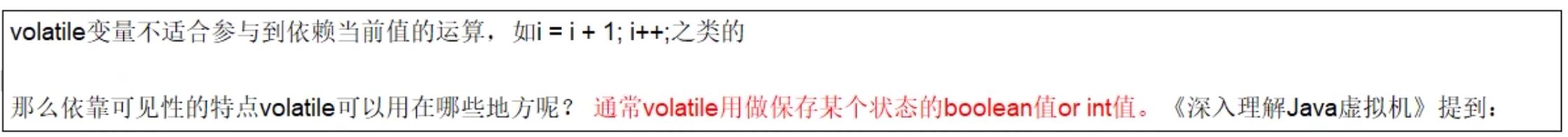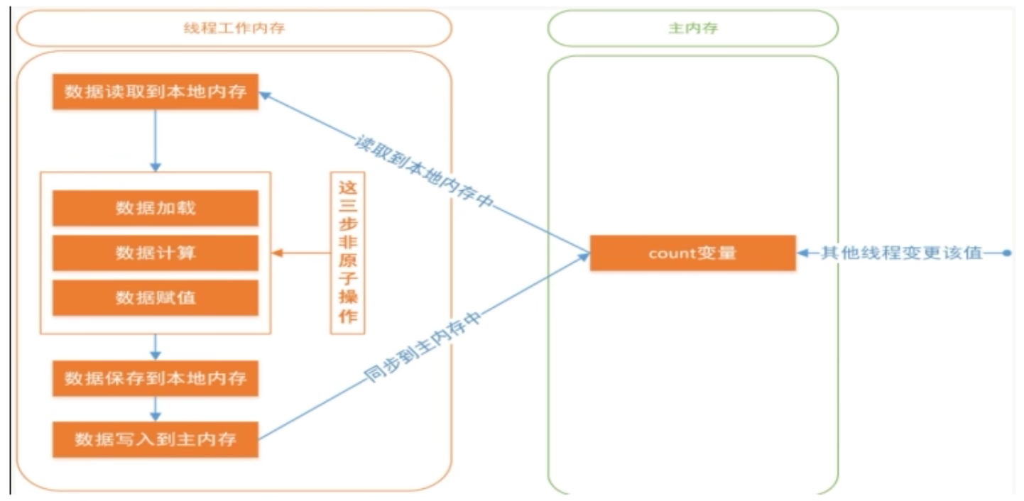 - 对于volatile变量具备可见性,JVM只是保证从主内存加载到线程工作内存的值是最新的,也仅是数据加载时是最新的。但是多线程环境下,“数据计算“和”数据赋值”操作可能多次出现,若数据在加载之后,若主内存volatile修饰变量发生修改之后,线程工作内存中的操作将会作废去读主内存最新值,操作出现写丢失问题。即各线程私有内存和主内存公共内存中变量不同步,进而导致数据不一致。由此可见volatile解决的是变量读时的可见性问题,但无法保证原子性,对于多线程修改主内存共享变量的场景必须使用加锁同步。