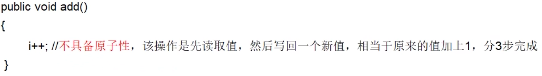 如果第二个线程在第一个线程读取旧值和写回新值期间读取i的域值,那么第二个线程就会与第一个线程一起看到同一个值,并执行相同值的加1操作,这也就造成了线程安全失败,因此对于add方法必须使用synchronized修饰以便保证线程安全。