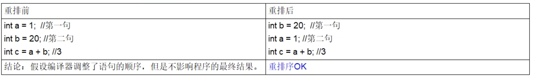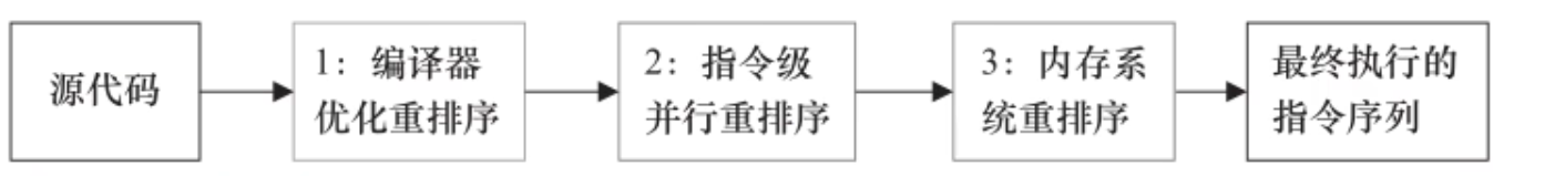 - 指令级并行的重排序:处理器使用指令级并行技术来讲多条指令重叠执行,若不存在数据依赖性,处理器可以改变语句对应机器指令的执行顺序。