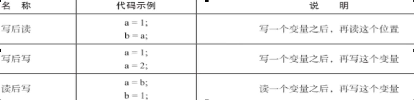 数据依赖性:若两个操作访问同一变量,且这两个操作中有一个为写操作,此时两操作间就存在数据依赖性。