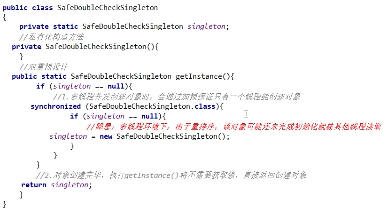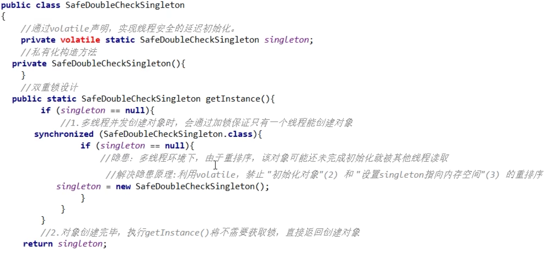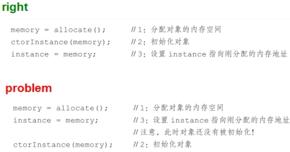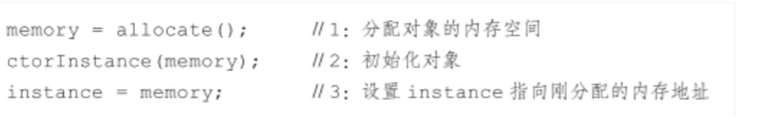 隐患:多线程环境下,在”问题代码处”,会执行如下操作,由于重排序导致2,3乱序,后果就是其他线程得到的是null而不是完成初始化的对象。