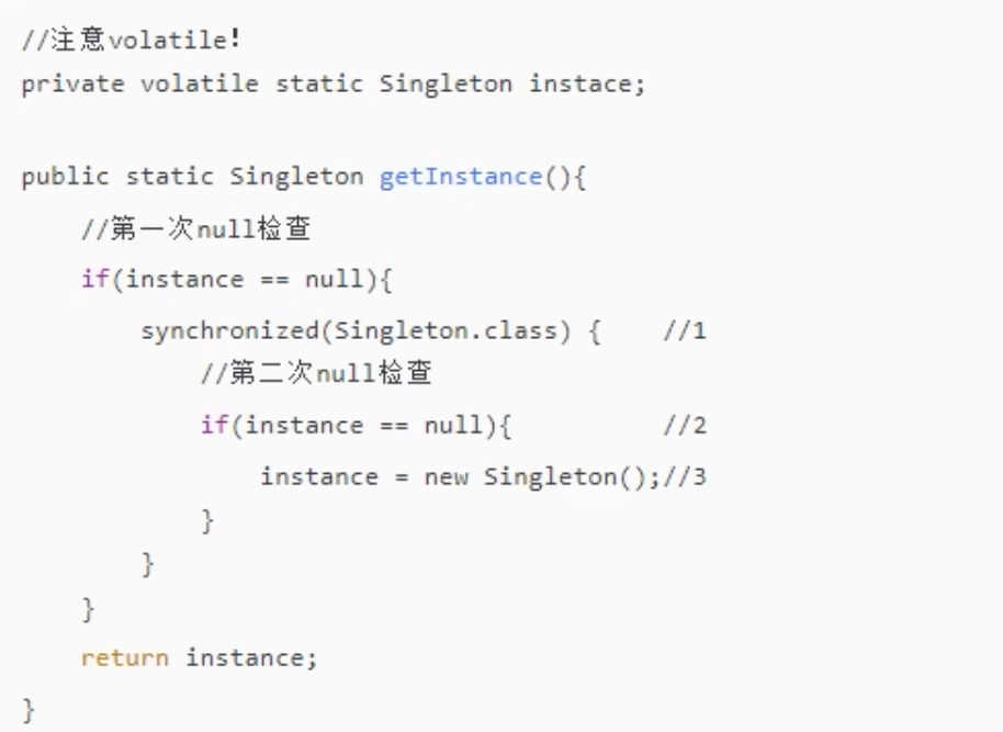 - 其中第3步中实例化Singleton分多步执行(分配内存空间、初始化对象、将对象指向分配的内存空间),某些编译器为了性能原因,会将第二步和第三步进行重排序(分配内存空间、将对象指向分配的内存空间、初始化对象)。这样,某个线程可能会获得一个未完全初始化的实例。