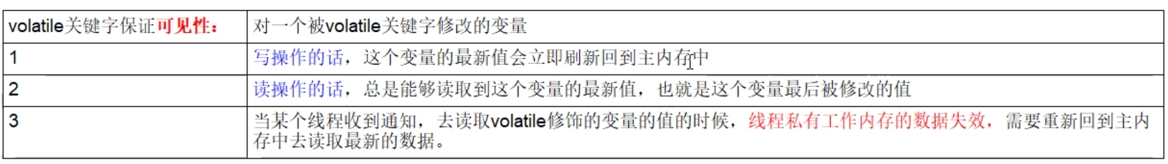 - 线程中读取的时候,每次读取都会去主内存中读取共享变量最新的值,然后将其复制到工作内存。