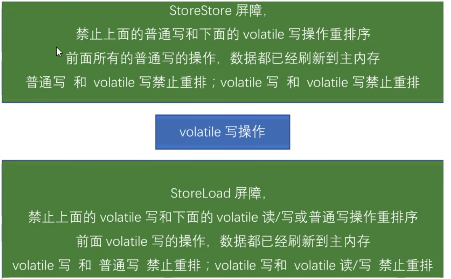 写屏障(Store Memory Barrier):告诉处理器在写屏障之前将所有存储在缓存(store bufferes)中的数据同步到主内存。也就是说当看到Store屏障指令,就必须把该指令之前所有写入指令执行完毕才能继续往下执行。