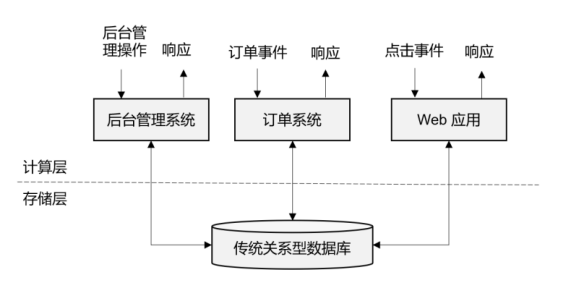 IT互联网公司往往会用不同的应用程序来处理各种业务。比如内部使用的企业资源规划(ERP)系统、客户关系管理(CRM)系统,还有面向客户的Web应用程序。这些系统一般都会进行分层设计:“计算层”就是应用程序本身,用于数据计算和处理;而“存储层”往往是传统的关系型数据库,用于数据存储,如图所示。