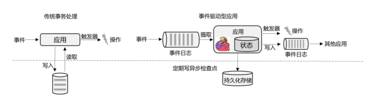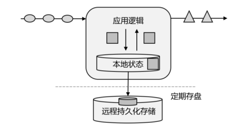 不难想到,如果我们对于事件流的处理非常简单,例如收到一条请求就返回一个“收到”, 那就可以省去数据库的查询和更新了。但是这样的处理是没什么实际意义的。在现实的应用中,往往需要还其他一些额外数据。我们可以把需要的额外数据保存成一个“状态”,然后针对这条数据进行处理,并且更新状态。在传统架构中,这个状态就是保存在数据库里的。这就是所谓的“有状态的流处理”。