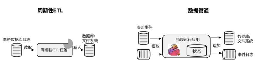 所谓数据管道的作用与ETL类似。它们可以转换和扩展数据,也可以在存储系统之间移动数据。不过如果我们用流处理架构来搭建数据管道,这些工作就可以连续运行,而不需要再去周期性触发了。比如,数据管道可以用来监控文件系统目录中的新文件,将数据写入事件日志。连续数据管道的明显优势是减少了将数据移动到目的地的延迟,而且更加通用,可以用于更多的场景。如图所示,展示了ETL与数据管道之间的区别。