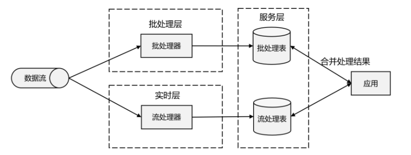 Lambda 架构主体是传统批处理架构的增强。它的“批处理层”(Batch Layer)就是由传统的批处理器和存储组成,而“实时层”(Speed Layer)则由低延迟的流处理器实现。数据到达之后,两层处理双管齐下,一方面由流处理器进行实时处理,另一方面写入批处理存储空间, 等待批处理器批量计算。流处理器快速计算出一个近似结果,并将它们写入“流处理表”中。 而批处理器会定期处理存储中的数据,将准确的结果写入批处理表,并从快速表中删除不准确 的结果。最终,应用程序会合并快速表和批处理表中的结果,并展示出来。